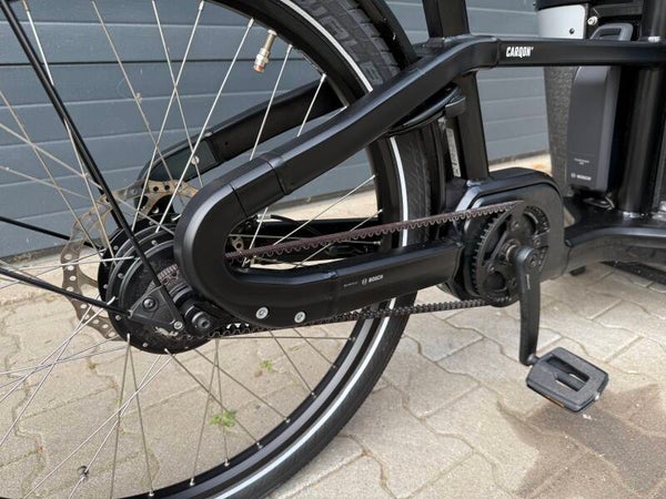 Carqon elektrische bakfiets met krachtige Bosch middenmotor (85 Nm) en totaal 400Wh accu. en Onderhoudsarme Beltdrive riemaandrijving. compleet met Reservesleutels en Gordel voor in de bak.